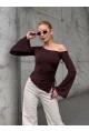 Kadın Bel Detay Kayık Yaka Uzun Kol Kahve Bluz