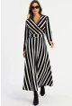 Zarif kemer detayı ile belinizi vurgulayan kruvaze kesim, feminen bir siluet sunar; Çizgili deseniyle modern ve şık bir görünüm kazandıran bu maxi elbise, günlük kullanımda da özel günlerde de tercih edilebilir; Örme kumaş yapısı sayesinde esneklik ve konforu bir arada sunarak gün boyu rahat hareket etme olanağı sağlar; Uzun boyu ile hem rahatlık hem de şıklığı bir arada sunan bu elbise, yaz akşamları için idealdir;