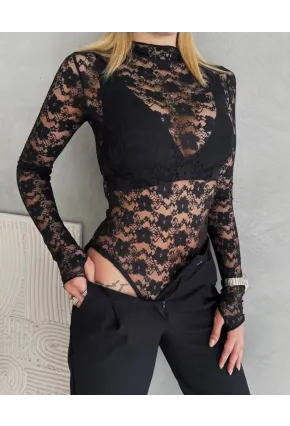 Ful Likralı Dantel Bodysuit Kol Ucu Parmak Geçmeli