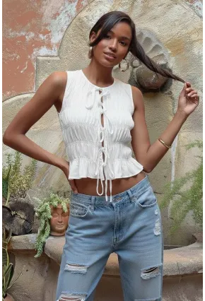 Beyaz Büzgülü Bağlamalı Crop Bluz Bohem Şık Gipe Detaylı